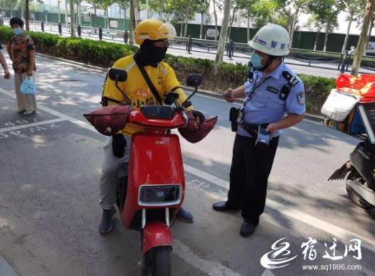 6月24日行動中,“uu跑腿”唐某在宿豫區(qū)項王東路與松花江路交叉口闖紅燈,被執(zhí)勤交警查獲,并處以50元罰款;“閃送”快遞員王某在宿豫區(qū)項王東路與松花江路交叉處未佩戴安全頭盔被處以50元罰款。
