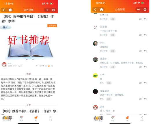 本次活動的開展既能方便大家在手機上通過“掌上云社區(qū)”參與閱讀與討論,還能夠引導帶動大家積極參與答題,寫出自己心中感受,讓閱讀成為一種習慣。社區(qū)居民們在評論中也表示,讀書是一輩子的事,多看書,看好書,才能開拓眼界,提升素質(zhì)。社會在發(fā)展,科學在不斷地創(chuàng)新,活到老學到老,才能跟上社會發(fā)展的步伐。