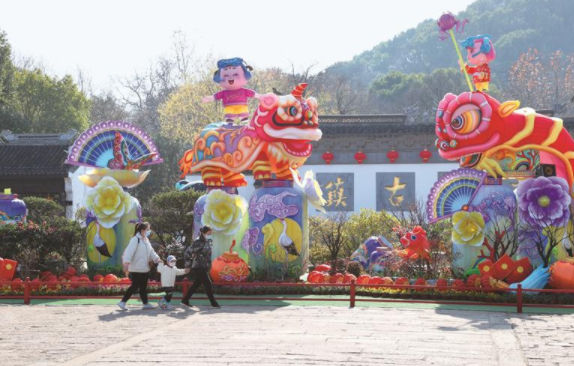 1月12日,游客從惠山古鎮(zhèn)新春景觀前經(jīng)過。春節(jié)臨近,錫城街頭張燈結(jié)彩,年味漸濃,人們以各種形式喜迎佳節(jié)。(宦瑋 攝)