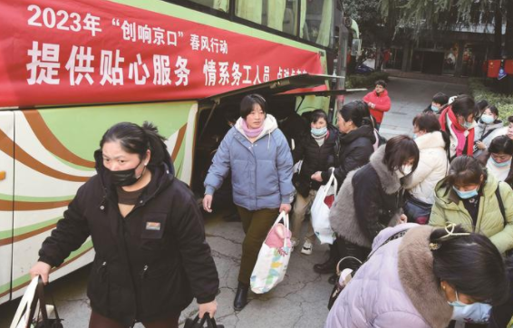 1月29日,經(jīng)過近5個小時的車程,鎮(zhèn)江京口區(qū)2023年“創(chuàng)響京口”春風(fēng)行動“點對點”專車接回的38名安徽宿州首批返崗人員順利抵達江蘇惠通集團宿舍區(qū)。京口區(qū)人社部門工作人員為返崗員工送上了“春風(fēng)卡”“就業(yè)創(chuàng)業(yè)政策匯編”等材料。王呈 莊嚴(yán) 攝影報道