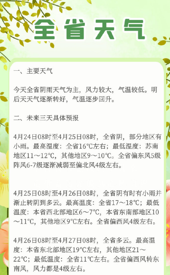 4月24日8時至4月25日8時,全省陰,部分地區(qū)有小雨。最高溫度:全省16℃左右;最低溫度:蘇南地區(qū)11~12℃,其他地區(qū)9~10℃。全省偏東風(fēng)5級陣風(fēng)6-7級逐漸減弱至偏北風(fēng)4級左右。