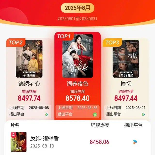 由霍建華、黃宗澤強強聯合,主演的短劇《搏憶》收官了。八月份短劇熱播排行榜上熱度僅僅排到第三,距離還比它遲將近一個星期播出的不知名演員出演的土味短劇《飼養(yǎng)夜色》,還有一定差距。