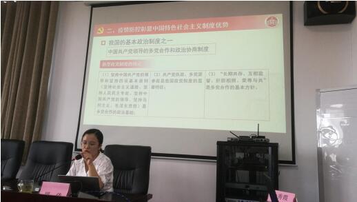 隨后,邀請區(qū)委黨校胡倩老師開展了一堂主題為《疫情防控彰顯中國特色社會主義制度優(yōu)勢》的黨課,運用通俗易懂的語言、簡單明了的案例,帶領黨員感受戰(zhàn)“疫”的中國力量,深入了解疫情之下,中國共產(chǎn)黨領導和中國特色社會主義制度的優(yōu)勢。