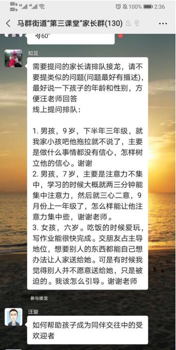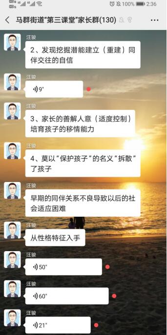 “家長如有什么疑問,在微信群內(nèi)留言,就可得到回復。”蛇盤社區(qū)以“共建、共享、共育”為理念,將提升家庭教育水平作為日常工作的重要部分,鏈接多方資源,助力“第三教室”。除了常規(guī)的家長課堂,社區(qū)黨總支還聯(lián)合幼兒園組建“馬群街道‘第三課堂’家長群”,線上開課,幫助家長充電增能。指導老師汪駿通過語音授課的方式,教授家長們先進的育兒知識,讓家長能夠利用閑暇時間充實教育理念,掌握育兒方法。其中,《如何幫助孩子成為同伴交往中的受歡迎者》、《家長應把握的幼小銜接關鍵點》等課程受到了家長的歡迎。一位小朋友家長表示,她很喜歡這樣的線上學習交流,而線下的家長課堂,有時候不好意思提問。當他在線上看到大家的提問時,才知道大家都有著相同的問題。因此,家長們有了專家老師的指導,瞬間焦慮就“煙消云散”了。