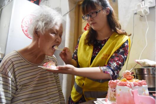 社區(qū)最初計劃將居家養(yǎng)老大廳布置布置,買上生日蛋糕,給老人唱生日歌一同慶賀。根據(jù)社區(qū)便民服務(wù)中心全科社工了解到的情況,劉爺爺?shù)睦习閮宏愑裣慊加芯袢墯埣玻瑫r而清醒、時而糊涂,經(jīng)常性犯病不吃不喝不睡,亂發(fā)脾氣,劉爺爺只能不分白天黑夜地照顧著、陪著她,日日如此,根本沒有自己的時間和空間。考慮到老人身邊離不開人照顧的情況,社區(qū)工作人員貼心的將“生日會場”挪到了老人家中,這一下,老兩口可開心了。劉爺爺將切下的第一塊蛋糕遞給了老伴兒,看著老伴兒心情好的吃著蛋糕,劉爺爺也十分開心,笑的合不攏嘴。看著陳奶奶自己吃的費勁,志愿者接過蛋糕盤,一口一口將蛋糕喂到老人的口中,為這對特殊的老夫妻過了一個特別的生日。