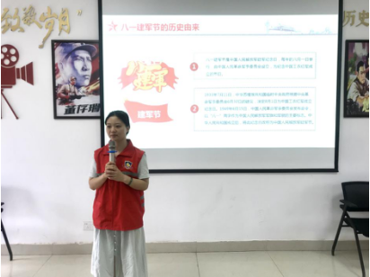 活動開始,志愿者用PPT給大家講解了建軍節(jié)的歷史由來。1933年7月11日,中華蘇維埃共和國臨時中央政府根據(jù)中央革命軍事委員會6月30日的建議,決定8月1日為中國工農(nóng)紅軍成立紀(jì)念日;1949年6月15日,中國人民革命軍事委員會發(fā)布命令,以“八一”兩字作為中國人民解放軍軍旗和軍徽的主要標(biāo)志;中華人民共和國成立后,將此紀(jì)念日改稱為中國人民解放軍建軍節(jié)。