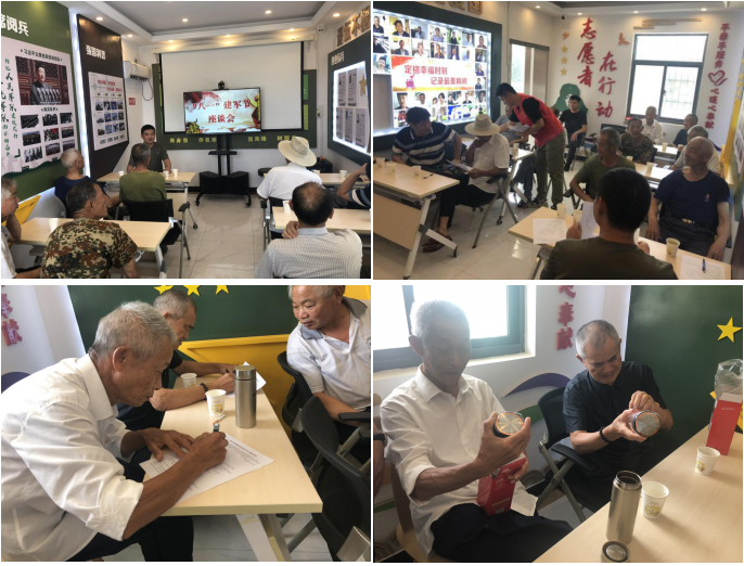一朝入伍,終生是兵。此次活動(dòng)中,建設(shè)村退役軍人代表們首先在志愿者的帶領(lǐng)下觀看了湯山街道退役軍人服務(wù)站宣傳片。隨后,在召開(kāi)的“八一”建軍節(jié)座談會(huì)中,志愿者為大家發(fā)放問(wèn)卷調(diào)查,更多的了解大家對(duì)退役軍人服務(wù)站成立一年以來(lái)工作開(kāi)展的認(rèn)可度、相關(guān)意見(jiàn)建議以及大家的困難和訴求。填寫(xiě)完問(wèn)卷調(diào)查后,志愿者將印有建設(shè)村退役軍人服務(wù)站的節(jié)日紀(jì)念品水杯送到退役軍人的手中,并為他們送去節(jié)日的祝福,讓大家切實(shí)感受到黨和政府的溫暖。接過(guò)水杯,輕松愉快的茶話會(huì)開(kāi)始了,志愿者們同退役軍人們下棋、聊天,大家暢所欲言,共敘戰(zhàn)友之情,再憶激情燃燒的崢嶸歲月,回顧了曾經(jīng)的軍旅生涯和退役軍人之后的工作經(jīng)歷及現(xiàn)在的退休生活和人生感想。活動(dòng)最后,大家合影留念,共同祝愿?jìng)ゴ蟮淖鎳?guó)更加繁榮富強(qiáng),軍隊(duì)建設(shè)更加強(qiáng)大,現(xiàn)場(chǎng)氣氛溫馨融洽。