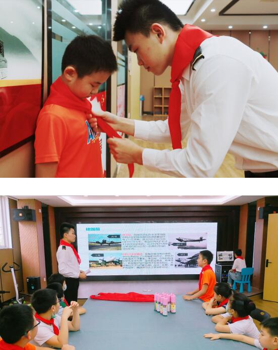 現(xiàn)場,志愿者通過播放視頻和現(xiàn)場講解,讓孩子們了解了“紅領(lǐng)巾”所代表著的深刻內(nèi)涵,感悟愛國主義精神,樹立投身祖國國防事業(yè)的理想。同時(shí),來自南京航空航天大學(xué)飛行技術(shù)專業(yè)的飛行學(xué)員林童身穿飛行制服,為社區(qū)的孩子們佩戴上了紅領(lǐng)巾,并細(xì)致地講解正確的紅領(lǐng)巾佩戴過程。隨后,飛行員向孩子們講述了國防科技與我國航空航天事業(yè)的發(fā)展史,講述一代代中國航空、航天人的科研事跡,孩子們紛紛用畫筆在紙上畫出了屬于自己的“小飛機(jī)”,并一筆一劃地簽上了自己的名字。并表示長大了想當(dāng)科學(xué)家,制造出更厲害的飛機(jī)!