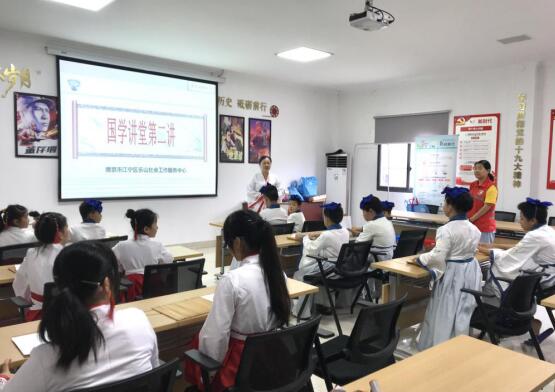 “端身正立,兩臂稍彎,十指并攏,拇指內(nèi)扣,雙手相疊于胸前,男生左手在上,女生反之……此為拱手禮”,活動開始,在國學老師的引導下,大家一步一步地跟著練習起來;“右手成拳,表示勇猛,左手為掌,表示德、智、體、美齊備,屈拇指表示不自大,左掌心按貼右拳面,左指尖與下顎平齊……此為抱拳禮。”志愿者帶領孩子們學習了平輩之間互敬所使用的拱手禮和抱拳禮。在充分掌握兩種禮儀的表現(xiàn)方式后,孩子們興高采烈地兩兩互敬,學著古人打起招呼來,在這邊一句“久仰久仰!”,在那邊一句“幸會幸會!”的氛圍中,志愿者和孩子們跟著老師誦讀起國學詩經(jīng)《小星》……青少年們認真地大聲朗讀,朗朗的讀書聲回蕩在課堂里。現(xiàn)場秩序十分良好,青少年們都全心投入到了活動中。在活動結束后,志愿者對部分參與者進行了回訪,參與的青少年說道,雖然對一些句子的含義不能深入理解,但在閱讀的過程中能夠認識很多生字,已經(jīng)是很大的收獲了。