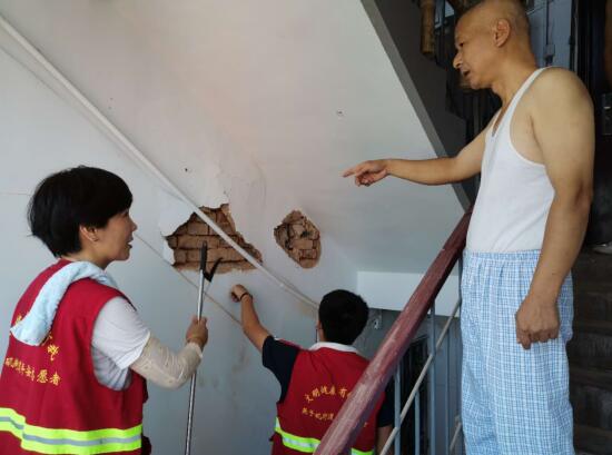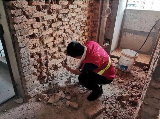 8月9日上午8點多,南京市棲霞區(qū)燕子磯街道電瓷社區(qū)1號網(wǎng)格員葉斌像往常一樣進行日常巡查,當走到勝利一村3幢二單元3、4樓之間的樓道時,發(fā)現(xiàn)樓道墻體異常,純白的墻面破損了兩處,有磚塊快要突出來,當即敲門入戶查看,發(fā)現(xiàn)裝修工人正在砸墻。“請立即停下來,外面樓道墻磚,我馬上聯(lián)系房主,這種裝修施工是不允許的。”隨即撥打了房主黃師傅的電話。