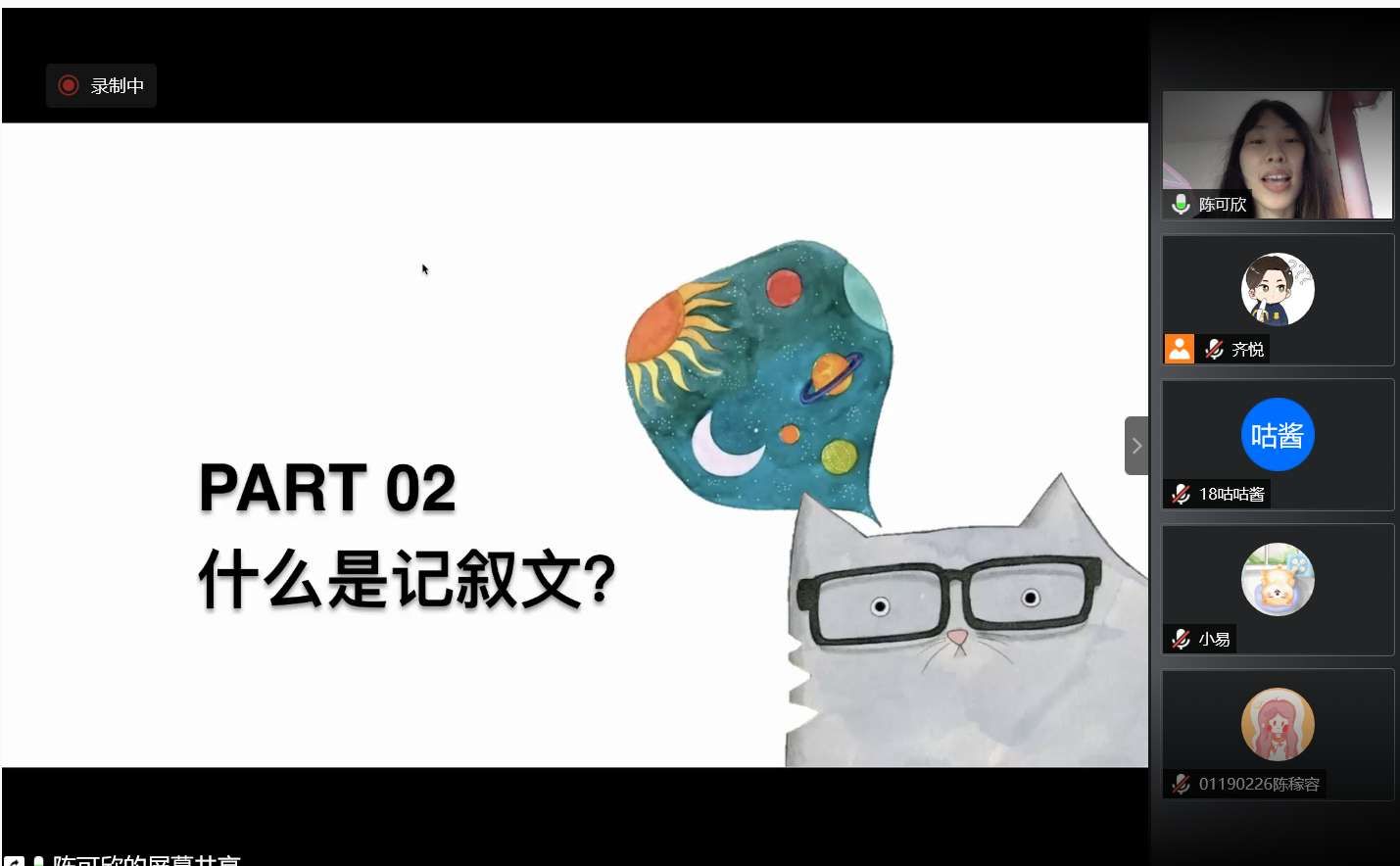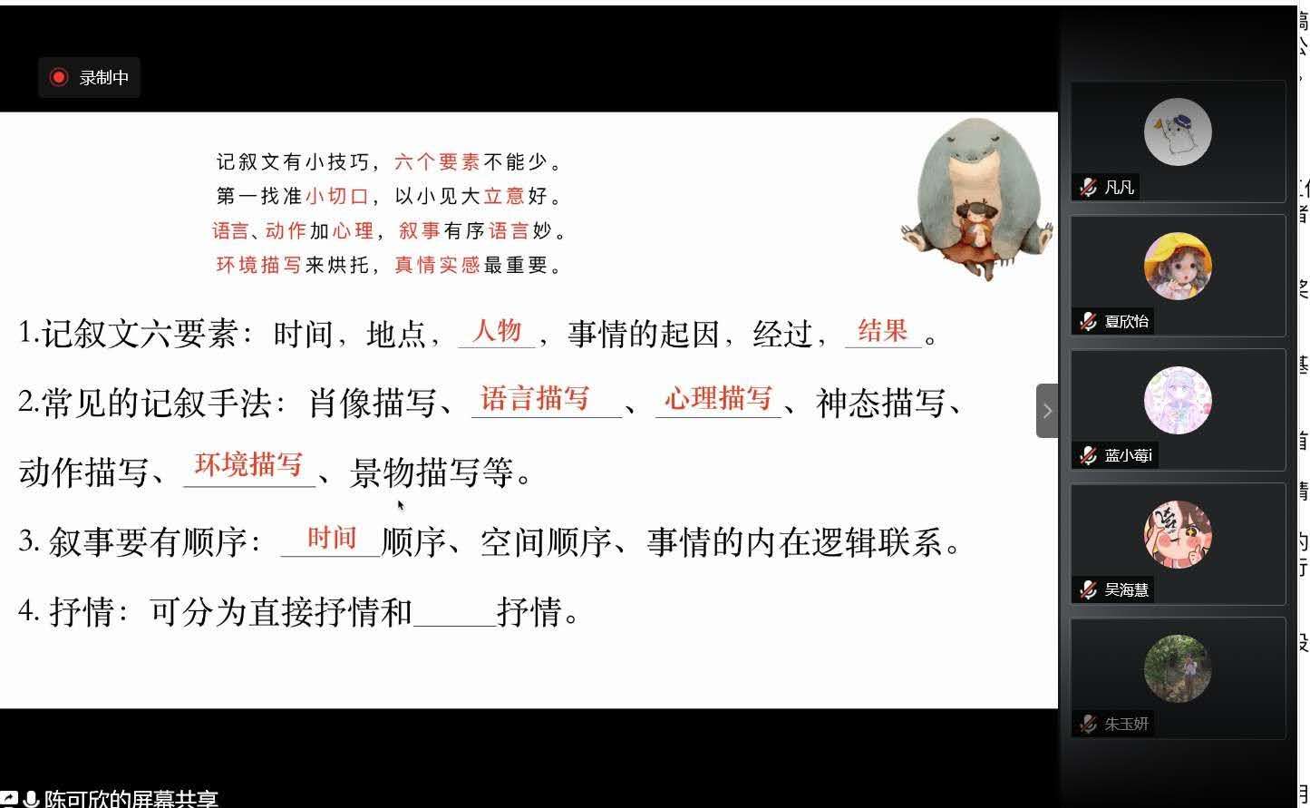 云朵課堂第四期特色課堂在下午三時許開始,文欣青協(xié)的志愿者們提前進(jìn)入騰訊會議進(jìn)行設(shè)備調(diào)試。下午三時十分,特色課堂第一部分開始,負(fù)責(zé)主講的志愿者賈梁同學(xué)向聽課的學(xué)生提出“你知道的抗‘疫’模范有哪些”的問題,與小朋友們開麥互動,并給出兩個抗“疫”事例,帶領(lǐng)學(xué)生一起學(xué)習(xí)疫情之下身邊人的抗疫精神,并講述如何使寫作不再像“流水賬”。第二部分由陳可欣同學(xué)主講,陳可欣同學(xué)給學(xué)生們講述記敘文的定義和記敘文六要素,并請學(xué)生們開麥答問題,巧妙將寫作重心轉(zhuǎn)向疫情之下的“我們”。接著,陳可欣同學(xué)以文章《門外有回音》為例,講述記敘文寫作的切口,并給學(xué)生們布置了小練筆作業(yè)。最后,主講人對前四次創(chuàng)意寫作小課堂的內(nèi)容進(jìn)行了總結(jié),舉行了閉營儀式。下午四時整,特色課堂全部結(jié)束,文欣青協(xié)的志愿者們與參與活動的孩子們道別。