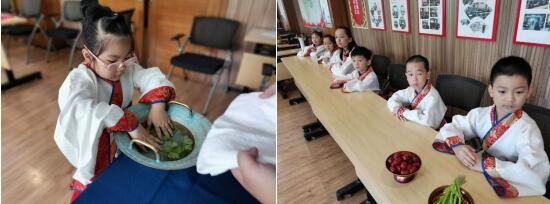 活動伊始,學(xué)生著漢服,整隊進場,老師置清水為同學(xué)們沃盥凈手,手執(zhí)柳葉或芹菜,蘸水點撒學(xué)生頭部,寓意頭腦清醒,勤奮努力;古人云:“大抵為人,先要身體端整。自冠巾、衣服、鞋襪,皆須收拾愛護,常令潔凈整齊。”“衣冠”不僅僅意味著遮羞,更重要的是反映出人的精神面貌。在老師的帶領(lǐng)下,孩子們學(xué)會正衣冠,要求冠必正,紐必結(jié),這正是——童蒙之學(xué),始于衣冠;先正衣冠,后明事理,師長也為學(xué)生和家長送去了祝福。