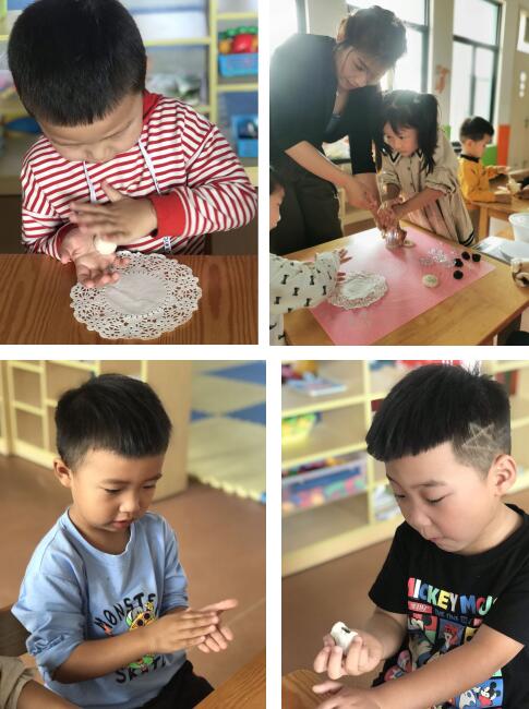 首先老師借助閱讀區(qū),為孩子們帶來(lái)關(guān)于中秋節(jié)的故事和兒歌。讓小朋友們了解到了中秋節(jié)的來(lái)歷,感受到中國(guó)傳統(tǒng)習(xí)俗的味道;接下來(lái)孩子嘗試制作月餅:從制作餡料的調(diào)制到月餅皮的制作,從包月餅餡再到用模具做出月餅,孩子們開心快樂的搟、壓、團(tuán),制作出一個(gè)個(gè)美味月餅。