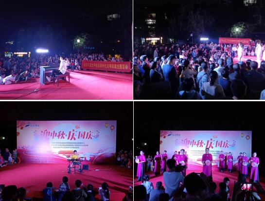 慶國(guó)慶,迎中秋。此次活動(dòng)在歌曲《盛世歡歌》中拉開帷幕,表演者用悠揚(yáng)的歌聲與動(dòng)人的旋律,燃起了現(xiàn)場(chǎng)觀眾的熱情。隨后國(guó)學(xué)朗誦、舞蹈、武術(shù)、黃梅戲、鋼琴獨(dú)奏等表演贏得了現(xiàn)場(chǎng)群眾的陣陣掌聲,演員們?cè)谖枧_(tái)上大展美妙舞姿,為晚會(huì)增光添彩,動(dòng)人歌聲,唱出人民群眾對(duì)祖國(guó)的熱愛,舞美歌亮、豐富精彩,活躍的氣氛展現(xiàn)出居民的精氣神,贊美了強(qiáng)大的祖國(guó),抒發(fā)了大家尊重傳統(tǒng)、繼承傳統(tǒng)、弘揚(yáng)傳統(tǒng)的豪情壯志,為轄區(qū)居民獻(xiàn)上了一場(chǎng)精彩的視覺盛宴,活動(dòng)的最后《我和我的祖國(guó)》大合唱為此次晚會(huì)拉下了帷幕。