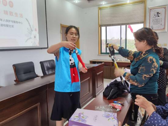 演示操作環(huán)節(jié),活動(dòng)現(xiàn)場(chǎng)氣氛活躍,個(gè)個(gè)熱情高漲。居民們跟隨著老師的步驟,讓一條絲巾成了百變絲巾:在娛樂(lè)場(chǎng)合,將絲巾在胸前打上個(gè)花結(jié),顯示端莊淑美;在正式場(chǎng)合,將大絲巾披在肩上,展示華麗與優(yōu)雅;在休閑場(chǎng)合,將花絲巾系在頸后,便多了幾分飄逸的動(dòng)感。