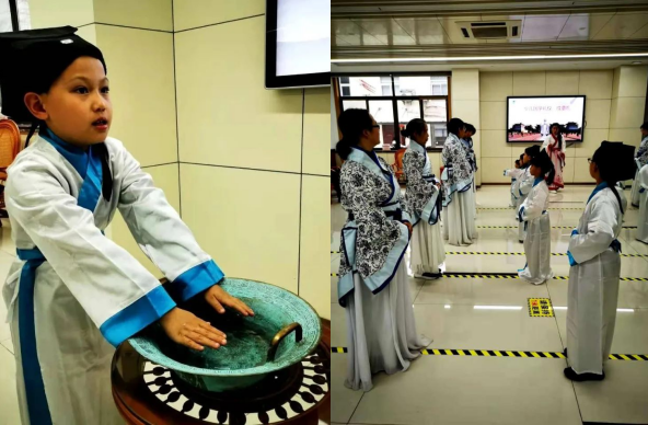 11月22日上午,東山社區(qū)居委會與睿心公益共同為東山社區(qū)的居民帶來了一場傳統(tǒng)和有著深遠意義的啟蒙禮儀式,通過穿漢服,習(xí)漢禮,讓孩子們感受中華傳統(tǒng)文化的光輝燦爛,在成長中表達對父母的感恩之情?;顒蝇F(xiàn)場,伴隨著優(yōu)雅古樸的樂聲,專家國學(xué)老師穿著漢服上臺,為即將進行啟蒙禮的孩子和陪同的家長們講解啟蒙禮的意義,并介紹漢服、學(xué)習(xí)揖禮?;顒又?,沃盥凈手是古人在做重要的事情之前,都要洗凈雙手,表示對事物的恭敬。沃盥之禮始于西周,因其繁瑣的儀式環(huán)節(jié)在戰(zhàn)國時期漸漸消失,今日復(fù)原沃盥之禮,去其繁瑣,存其精華,凈手靜心!