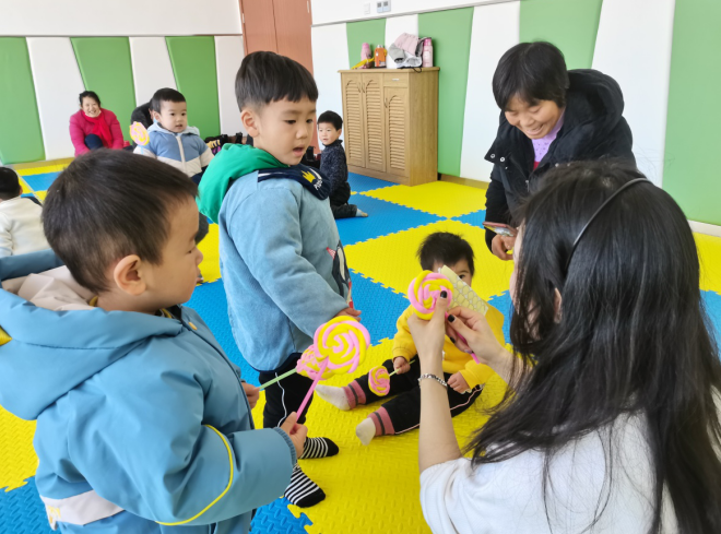 活動(dòng)開始,在《walking walking》歡快的音樂聲中,家長(zhǎng)和孩子們大手拉小手,踩著節(jié)拍圍成圈圈運(yùn)動(dòng),感受韻律的美好;隨后,孫老師通過擊鼓傳球的方式,點(diǎn)名孩子向大家問好,緊密了彼此的聯(lián)系,鍛煉了社會(huì)交際能力;在認(rèn)知游戲《open shut them》、《baby shark》中,孫老師拿出卡片,激發(fā)孩子們的好奇心,引導(dǎo)他們認(rèn)識(shí)了更多的小生物;活動(dòng)還穿插了剪花、夾氣球、手指操環(huán)節(jié),倡導(dǎo)大家放松身體,平衡四肢力量,在手工訓(xùn)練和運(yùn)動(dòng)游戲中盡情發(fā)揮想象力,提高手腳靈活性。游戲現(xiàn)場(chǎng),大家都玩得不亦樂乎,屋外寒風(fēng)凜冽,卻敵不過熱火朝天的活動(dòng)氛圍,在依依不舍中,大家一起吹泡泡、唱再見歌、拍照留念。最后,孫老師還發(fā)放了精美的貼紙作為獎(jiǎng)勵(lì),孩子們臉上洋溢著幸福而滿足的笑容。