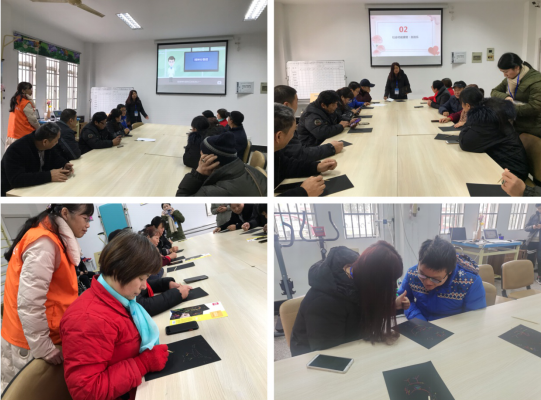 活動開始,志愿者通過小視頻帶領(lǐng)殘友們了解“精神分裂癥”的含義、以及精神分裂癥對日常生活的影響和精神分裂癥的有效治療方式,并鼓勵大家給予“精神分裂癥”人群關(guān)心和呵護?;顒舆€準(zhǔn)備了“刮刮樂”和“神秘的力量”等小游戲。“刮刮樂”,是一種新型的繪畫方式。學(xué)習(xí)刮畫的過程中,包含了視覺搜索、選擇、分配等能力,對于精神殘疾人而言是一項不錯的練習(xí)。看到“黑紙”變成“彩色畫”,大家都驚嘆很神奇。有的殘友越刮越來勁,直到將一整張畫紙刮出了色彩鮮明的方格圖。有一位殘友用手中的竹簽筆在畫紙上寫道“希望我們每一位殘疾人都能開心快樂度過每一天”。不一會兒功夫,多姿多彩的圖畫作品就如魔術(shù)般躍然紙上。大家?guī)缀醵疾患s而同地在畫中表達了對彼此的美好祝愿。接著進行“神秘的力量”,大家對心理暗示都感覺到非常好奇?;顒幼詈?,志愿者帶領(lǐng),每位殘友都握緊拳頭,放在胸前,一起喊出口號:“我是一個積極進取的人!”“我是一個勇敢的人!”“我是最棒的!”說完后,大家臉上都呈現(xiàn)出了一定的自信和氣勢。