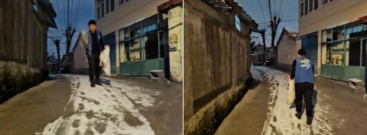 大雪紛飛,掃雪不停。谷里社區(qū)志愿者們有序分工,分頭行動(dòng),積極做好掃雪除冰工作。為了不讓積雪上凍影響老百姓出行,網(wǎng)格員傅良校連夜行走在轄區(qū)空曠無(wú)人的道路上,一手拿著裝滿融雪劑的袋子,一手向沿街路面上灑上撒融雪劑,加速路面積雪的融化。在社區(qū)的另一邊,志愿者們伴著點(diǎn)點(diǎn)燈光,以不畏嚴(yán)寒、團(tuán)結(jié)一心的干勁,在夜色下拿著鐵鍬、鏟子等勞動(dòng)工具,不怕苦不怕累的將路面上的結(jié)冰鏟除干凈,及時(shí)消除雪天帶來(lái)的安全隱患。
