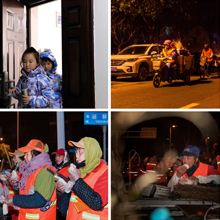 凌晨五點(diǎn),當(dāng)薄雪籠罩的南京尚未蘇醒時(shí),“城市美容師”們不俱寒冷,在刺骨的寒風(fēng)里穿梭勞動(dòng),“寧愿一人臟,換來萬家凈”。另一邊燈火昏明的室內(nèi),小志愿者們第一次見到凌晨五點(diǎn)的南京,他們冒著刺骨的寒風(fēng),走出家門,來到街道,親眼了解到一直以來他們覺得時(shí)刻干凈清爽的街道背后原來是環(huán)衛(wèi)工人們頂著寒風(fēng)默默辛勤勞作的成果。