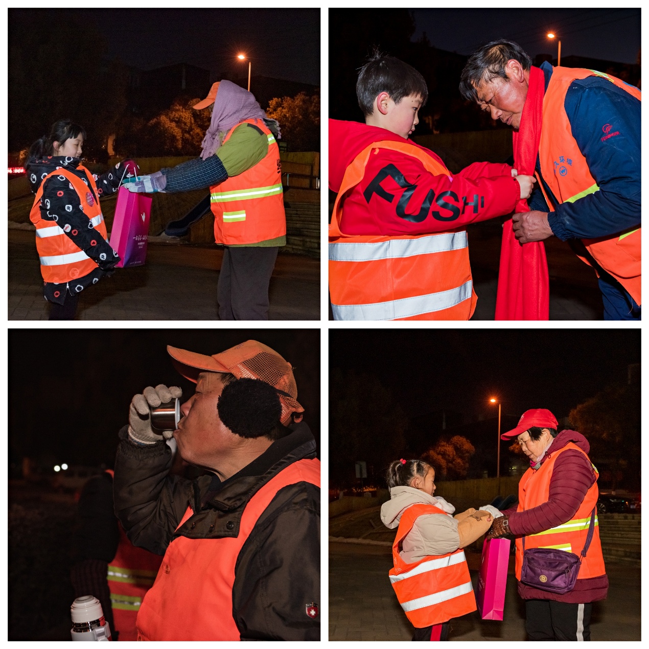 “叔叔阿姨辛苦啦!謝謝你們!因?yàn)橛心銈?我們才有干凈的生活環(huán)境!”小志愿者一個(gè)個(gè)手捧著點(diǎn)心、圍巾、裝滿親手制作姜茶的保溫杯,送給環(huán)衛(wèi)工作者手中,并以自制小卡片的形式對(duì)他們送上冬日里溫馨的祝福。寒風(fēng)瑟瑟,不少孩子的臉凍得紅紅的,但大家的臉上卻洋溢著興奮的笑容。身為“城市美容師”的環(huán)衛(wèi)工人們也因?yàn)樾⌒≈驹刚咚蜕系哪且槐?、一份暖心禮物而感到油然的溫暖。