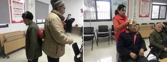 溫暖的祝福之后,隨即開始熱身小游戲。志愿者把老人兩兩一組,背靠背放一只氣球,要求從起點到終點合作完成,目的鍛煉老人的身體靈活性和協(xié)調(diào)性,由于動作簡單又富有趣味性,老人們立刻互動起來,把活動氣氛推向了高潮。
