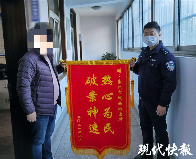 1月18日下午,民警將9.8萬元如數(shù)退還到王先生手中,被騙錢財失而復(fù)得,王先生和家人十分感激,特意制作了一面錦旗送到派出所辦案民警手中。