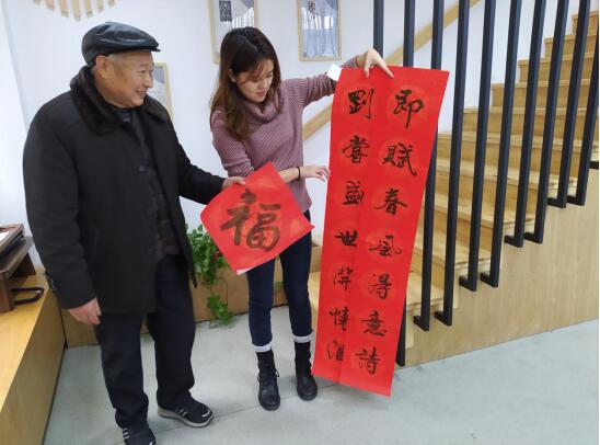 過新年、送福字、貼春聯(lián)是中華民族的傳統(tǒng)文化,是象征吉祥、表達(dá)人們向往美好生活的民族風(fēng)俗。在社區(qū)黨群服務(wù)站,只見桌上鋪滿了喜氣的大紅紙,張廣立老師鋪開紙硯,筆酣墨香,龍飛鳳舞,一幅幅喜慶的對(duì)聯(lián)承載著滿滿的祝福,在他的手中隨筆而出??瑫?、隸書、行書、草書等作品風(fēng)格迥異,各具神韻,讓大家充分領(lǐng)略到書法藝術(shù)經(jīng)久不衰的魅力。