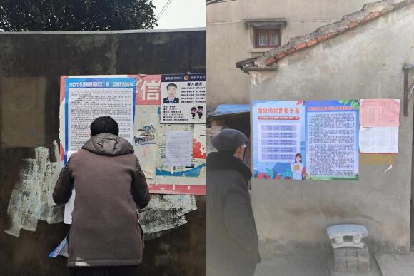 “冷鏈品,慎購買……”“有癥狀,早診治……”,活動中,工作人員在宣傳欄、道路旁拉起醒目的橫幅,精煉簡潔、節(jié)奏明快的標(biāo)語時時提醒著過往村民注意防疫細(xì)節(jié)。此外,工作人員還張貼了疫情防控指南和南京市民防疫十條,傳達(dá)更全面的疫情防控要求和措施,以便村民們根據(jù)自身需求,對照相應(yīng)規(guī)定合理作出安排。