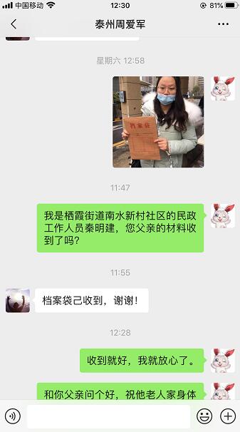 社區(qū)考慮到老人參軍時的檔案若遺失很難補(bǔ)齊,多次和老人兒子溝通檔案移交方式,老人兒子有個鄰居居住在雨花區(qū)打工,最近回泰州老家。社區(qū)工作人員了解情況后立刻驅(qū)車到雨花區(qū)把檔案交到其鄰居手中,后又與老兵兒子聯(lián)系,最終將檔案送至老人手中。