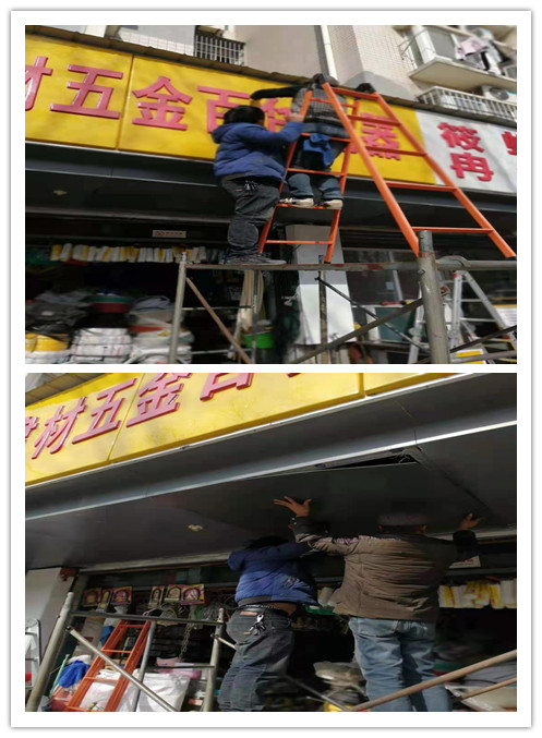 針對該種情況,社區(qū)第一時間組織人員對破損的門頭進(jìn)行整改,現(xiàn)場,工作人員搬來長梯,一名隊(duì)員扶住梯子,兩名隊(duì)員則爬上梯子,齊心協(xié)力將破損門樓廣告拆除,并對門頭進(jìn)行了清洗,美化市容市貌、杜絕安全隱患的發(fā)生。