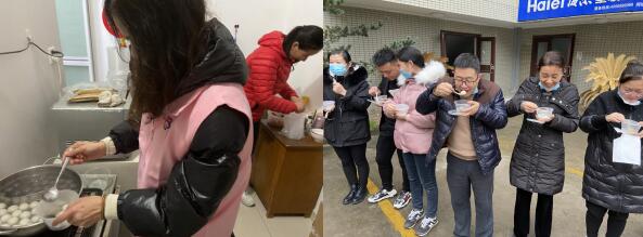 為了讓留寧員工能過(guò)一個(gè)圓圓滿滿的元宵節(jié),社區(qū)婦聯(lián)工作人員與谷里工業(yè)園一家專(zhuān)門(mén)生產(chǎn)口罩的嘉威醫(yī)療器械公司取得聯(lián)系,了解到今年春節(jié)他們員工為了響應(yīng)政府號(hào)召,幾乎沒(méi)有回家過(guò)年的。為了表示對(duì)他們的關(guān)心,在元宵節(jié)來(lái)臨之際,巾幗志愿者們?cè)缭鐏?lái)到社區(qū)煮起象征合家團(tuán)圓的糯米湯圓。熱騰騰的湯圓煮好后,巾幗志愿者們將寄托濃濃"愛(ài)心"的湯圓送到他們的手上,小小的湯圓里凝聚著對(duì)他們滿滿的祝福。并用特色的民俗表演—跑旱船,來(lái)表達(dá)對(duì)于留寧過(guò)年人員的感謝和敬意,員工們一遍吃著湯圓一遍觀看演出,臉上露出了幸福的微笑。