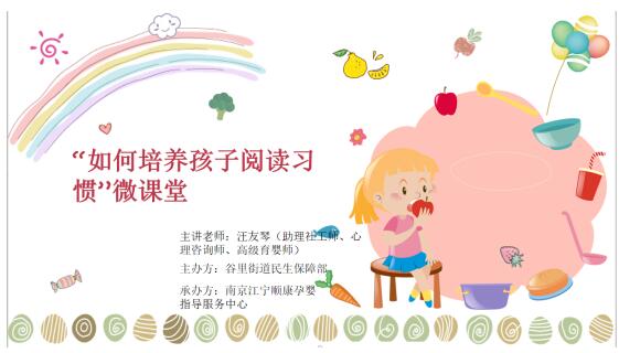 如何培養(yǎng)孩子的閱讀習慣?如何讓孩子愛上閱讀、喜歡閱讀?2月25日,南京市江寧區(qū)谷里街道民生保障部聯(lián)合南京江寧順康孕嬰指導服務中心開展以“如何培養(yǎng)孩子閱讀習慣”為主題的微課。