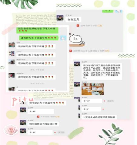 考慮疫情影響,本次活動采取通過語音、圖片、視頻、題目互動的形式。晚上19:00,隨著家長們陸續(xù)在微信群眾中打卡,本次微課堂正式開啟。課堂上,主講老師汪友琴緊緊圍繞宣講主題,以通俗易懂的語言和生動幽默的話語從六個方面著重介紹了培養(yǎng)孩子閱讀習慣的六大要點,并以惠普爾增說過的話語論證養(yǎng)成讀書好習慣的重要性?,F(xiàn)場,汪友琴還認真解答孩子們及孩子的家長對于課程中不理解的地方,做到讓他們學有所思,學有所獲。活動結束后,家長們紛紛表示參加這樣的“微課堂”非常有意義,希望多多多開展這類活動,幫助他們更好的教育孩子。