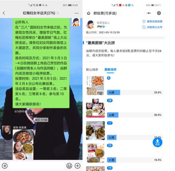 活動(dòng)期間,紅梅社區(qū)充分利用微信群等線上交流溝通的陣地,開展“最美廚娘”大比拼,轄區(qū)婦女群眾踴躍報(bào)名,線下大展廚藝,線上積極分享,共同交流制作美食的經(jīng)驗(yàn)。一張張圖片、一個(gè)個(gè)美食,讓默默在群里圍觀的看客們垂涎欲滴。