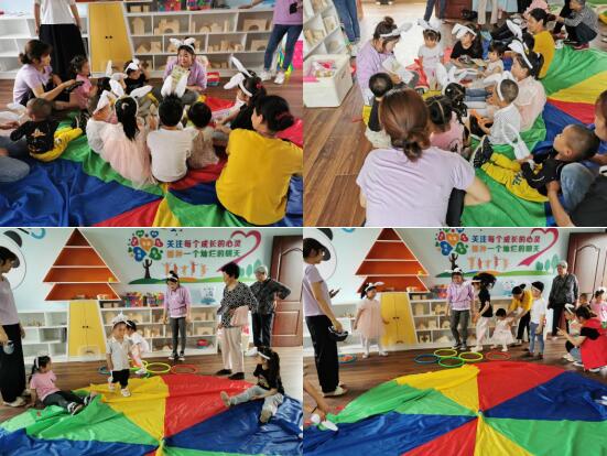 活動開始前,老師帶著寶寶們進(jìn)行小動物模仿操,培養(yǎng)寶寶的節(jié)奏感,漸漸地大家都消除了緊張的情緒,開始隨著音樂自由的搖擺著。之后老師又給寶寶們展示了一只可愛的小兔子,大家挨個(gè)介紹了自己。隨后大家又跟隨音樂《兔兒爺》跳動,和其他小朋友們一起全面的了解這只小兔子,不一會兒大家都喜歡上了這個(gè)小動物,迫不及待的想要戴上兔子耳朵的頭飾,小朋友們帶著兔子耳朵去采青菜、胡蘿卜,認(rèn)真又賣力。現(xiàn)場還設(shè)置了親子互動的環(huán)節(jié),小朋友們和家長手牽手在彩虹傘中嬉戲,現(xiàn)場氣氛歡樂無比,最后在家長與寶寶的共同合作中完成了小兔子的涂鴉作品,親子合影留念。