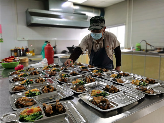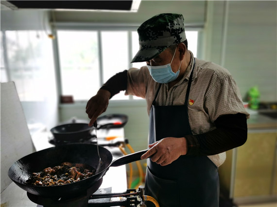 “吃飯咯,大家快開趁熱吃飯咯!”“大家有啥想吃的菜,也可以和我說,我們明天為大家做!”每天中午在打飯區(qū)都能聽到這樣的吆喝聲,這是老黨員為志愿者打餐的聲音。