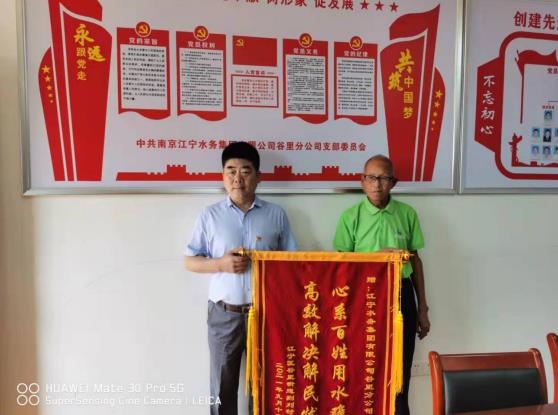 9月15日,南京市江寧區(qū)谷里街道荊劉村一名老黨員將一面寫有“心系百姓用水難,高效解決解民憂”的錦旗送到了水務(wù)集團谷里分公司總經(jīng)理金海濱那里,真誠感謝他帶領(lǐng)員工徹底解決荊劉村民的”老大難“。