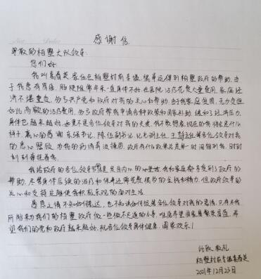袁春英患有胃癌和腸梗阻,常年來一直身體不好,在醫(yī)院治療花費(fèi)了大量的費(fèi)用,家里的經(jīng)濟(jì)負(fù)擔(dān)很重,無力負(fù)擔(dān)高額的治療費(fèi)用。了解到她的情況后,柏墅村積極幫助她申請(qǐng)各種政策和國(guó)家補(bǔ)助,希望可以緩解她的經(jīng)濟(jì)負(fù)擔(dān)。“多虧政府幫我申請(qǐng)了很多補(bǔ)貼,緩解了經(jīng)濟(jì)壓力,現(xiàn)在的身體也越來越好,如果不是各位領(lǐng)導(dǎo)對(duì)我的關(guān)愛,我不敢想象現(xiàn)在的我將會(huì)是什么樣子。”袁春英在自己的手寫感謝信中寫道。