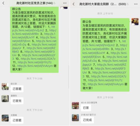 通過線上學習答題,社區(qū)居民可以最大限度不受時間、空間的限制,進一步擴大了防震減災(zāi)科普宣傳的覆蓋面,讓每一位居民都能學習到防震減災(zāi)相關(guān)知識?;顒又校鐓^(qū)工作人員通過網(wǎng)格群向居民發(fā)放防震減災(zāi)學習資料和答題鏈接,并向居民宣傳如何增強防災(zāi)減災(zāi)意識、出現(xiàn)危險情況如何自救互救等防災(zāi)減災(zāi)相關(guān)知識以及應(yīng)對防御自然災(zāi)害、抗震、避震、逃生、自救互救技巧。社區(qū)居民積極響應(yīng),紛紛主動學習、參與答題,“已完成,題目很實際,貼合生活,學到了很多。”