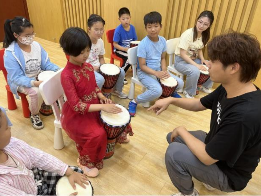 金貝鼓課上,志愿者張老師帶領(lǐng)孩子們了解了傳統(tǒng)樂(lè)器金貝鼓的起源、結(jié)構(gòu)構(gòu)造、基本音、坐姿、拍打手法等,孩子們表現(xiàn)出濃厚的學(xué)習(xí)興趣。在張老師的教授下,孩子們從一竅不通到能根據(jù)老師指令擊打出鼓音,超強(qiáng)的學(xué)習(xí)和領(lǐng)悟能力得到了老師和現(xiàn)場(chǎng)家長(zhǎng)的一致表?yè)P(yáng),為今后學(xué)習(xí)金貝鼓打下了結(jié)實(shí)的基礎(chǔ)。