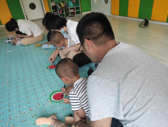 “今天好熱啊,熱的夏天吃什么好呢?我們一起吃西瓜吧!”常老師由日常談話導(dǎo)入今天的課程,帶領(lǐng)孩子們模仿吃西瓜,一邊用手做吃的動(dòng)作,一邊用手畫出圓形?,F(xiàn)場(chǎng)的家長(zhǎng)還和小朋友一起制作西瓜,在教具上用簽字筆隨著音樂點(diǎn)出西瓜籽,引導(dǎo)孩子們將西瓜籽放到垃圾桶里。