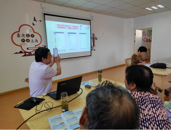 培訓(xùn)以PPT形式進(jìn)行,吳貞金老師將具體操作步驟通過圖文結(jié)合的方式展示給居民,同時在旁進(jìn)行現(xiàn)場演示與指導(dǎo),耐心地告知居民每一步該如何操作。為了鞏固學(xué)習(xí)成果,帶領(lǐng)老年居民實地操作,以便能夠加深印象,牢固掌握,當(dāng)居民遇到問題時,現(xiàn)場志愿者也會走到老人身邊幫助解答。居民們認(rèn)真聆聽、練習(xí),培訓(xùn)現(xiàn)場學(xué)習(xí)氛圍濃厚。