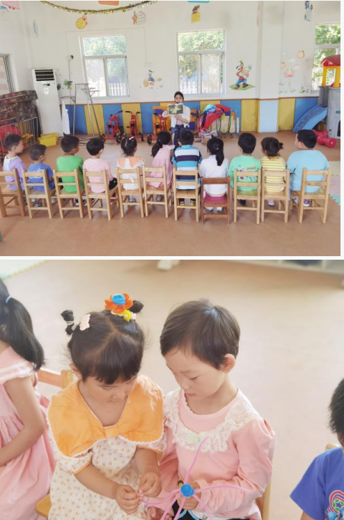活動(dòng)最后,孩子們?cè)诶蠋煹闹笇?dǎo)下,用扭扭棒做出一朵朵小花發(fā)卡和戒指,“我想把小花花送給老師,謝謝老師陪我們一起玩游戲。”