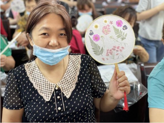 活動(dòng)進(jìn)入正式主題,社工首先講解了壓花團(tuán)扇的歷史傳統(tǒng),展示了精美的壓花團(tuán)扇,每個(gè)人都迫不及待地想要開始親自動(dòng)手。大家在社工的耐心指導(dǎo)下,經(jīng)過花材搭配、設(shè)計(jì)構(gòu)圖、上膠粘貼等步驟后,一把把獨(dú)一無二精美的團(tuán)扇就制成了。大家都高興地表示,在夏天一把小扇在手中搖一搖,既能驅(qū)趕蚊蟲,又能帶來絲絲涼風(fēng)。在一片歡樂溫馨的氛圍中,活動(dòng)也逐漸接近尾聲,參加活動(dòng)的婦女們都表示非常喜歡這樣的活動(dòng),也期待著下一場活動(dòng)的開展。