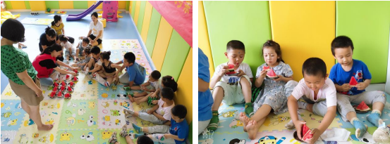 聽完老師講的故事,幼兒們分享了工作人員發(fā)的西瓜,同時仔細觀察著西瓜的樣子,為后面的手工制作打好基礎。在工作人員的指導和家長的幫助下,幼兒們用綠色的粘土做成瓜皮、白色和紅色做成瓜瓤,黑色的做成螞蟻,再用筆點綴上瓜子……一幅幅創(chuàng)意手工畫就在大家的巧手里完成了。