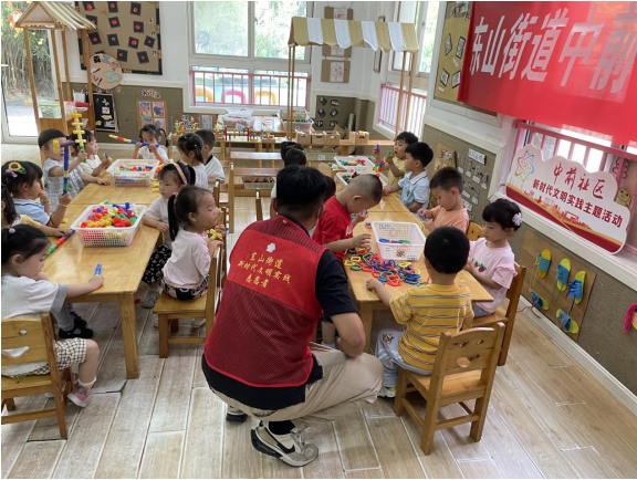 7月4日上午,南京市江寧區(qū)東山街道中前社區(qū)新時(shí)代文明實(shí)踐站志愿者聯(lián)合德美幼兒園開(kāi)展智慧搭建課程。致力于讓孩子們?cè)谕嬷袑W(xué)習(xí)知識(shí),在玩中發(fā)展智力。