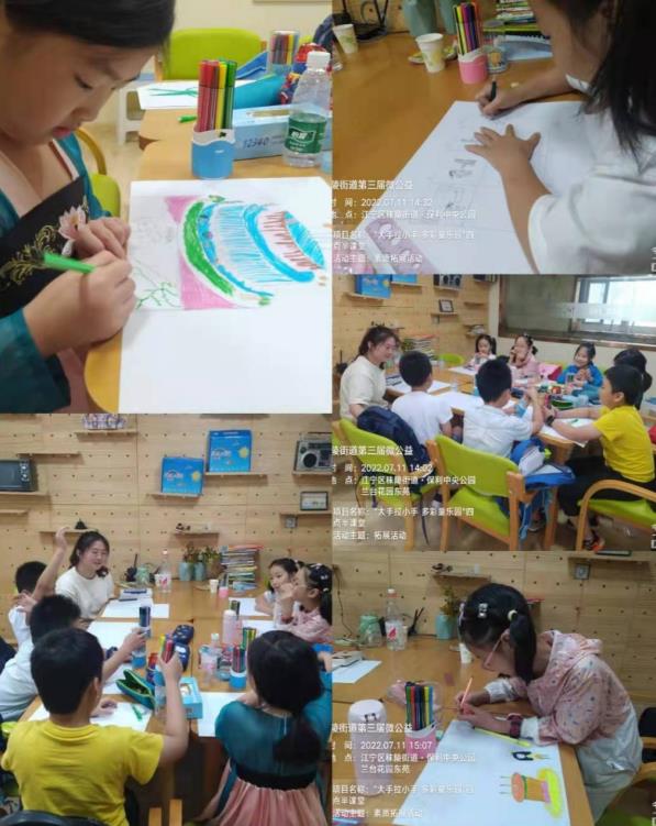 為豐富孩子們的暑假生活,7月11日下午,南京市江寧區(qū)秣陵街道殷巷社區(qū)志愿者驛站開展了“大手拉小手,多彩童樂園”四點鐘課堂,課堂上倡導孩子們發(fā)揮想象,繪出童夢。