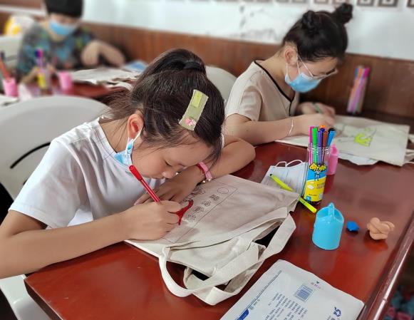 手繪環(huán)節(jié),大家拿起各色顏料細(xì)致涂抹,紅的綠的黃的白的顏料在靈巧的雙手間生成七彩斑娟的、符合畫面的顏色,慢慢地帆布包開始生動、鮮活起來。孩子們用色彩鮮明的顏色、耐心細(xì)致地繪出對祖國的熱愛。看著自己的成果,大家的臉上都露出燦爛的笑容。