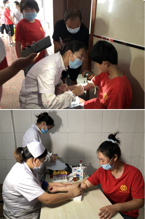 機構(gòu)的學(xué)員們,有的存在智力、語言障礙,有的患有自閉癥,有的則是腦癱患兒,所以,第一項抽血檢查就是個很大的挑戰(zhàn)。面對緊張的孩子們,醫(yī)護人員們在老師們的幫助下,用簡單手語和口語與孩子們溝通交流,為他們舒緩緊張的情緒,耐心地引導(dǎo)他們。在醫(yī)生、老師和家長的鼓勵下,孩子們放下了緊張與恐懼,十分配合地完成了一系列檢查。完成檢查后,學(xué)員小杰跟護士阿姨說:“我完成了!是不是特別勇敢?”護士阿姨笑著給了他肯定和鼓勵。